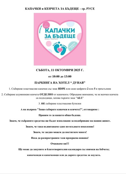 Благотворителната инициатива "Капачки за бъдеще" ще проведе събиране на пластмасови капачки и алуминиеви кенчета в Русе. Събитието ще се състои на 11 октомври 2025 г. (събота) от 10:00 до 13:00 часа на паркинга на хотел "Дунав".