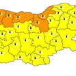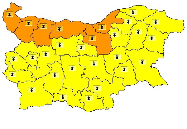 В останалите 22 области – София-област, София – град, Перник, Кюстендил, Благоевград, Пазарджик, Смолян, Кърджали, Пловдив, Ловеч, Габрово, Стара Загора, Хасково, Сливен, Ямбол, Търговище, Шумен, Бургас, Варна, Добрич, Силистра, Разград, Търговище. В областите със жълт код максималните температури ще са между 35-38 градуса.