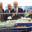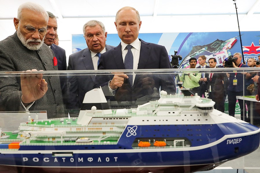 Индийският премиер Нарендра Моди, вицепремиерът Юрий Борисов, председателят на борда на "Роснефт" Игор Сечин и руският президент Владимир Путин (отляво надясно) инспектират макета на ледоразбивача "Лидер"