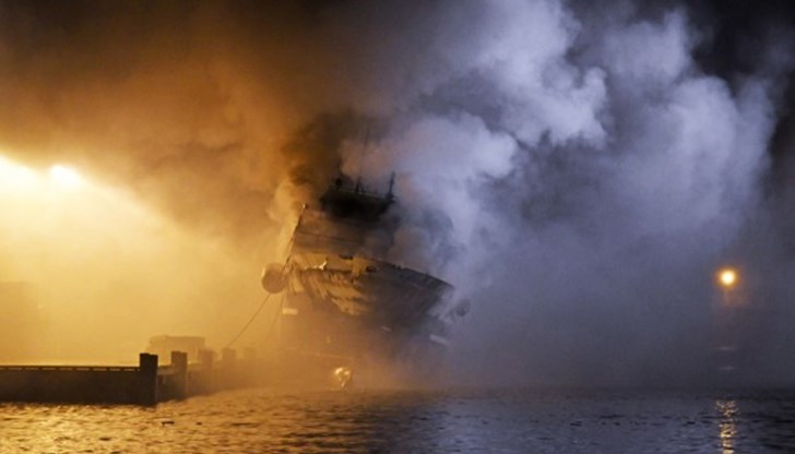 Над водата е само десният борд на плавателния съд, районът е задимен. Наблизо продължава да работи катер, оборудван с водно оръдие. Пожарникари очертаха около кораба зона за сигурност и евакуираха над 90 души в радиус от 300 метра от кея.