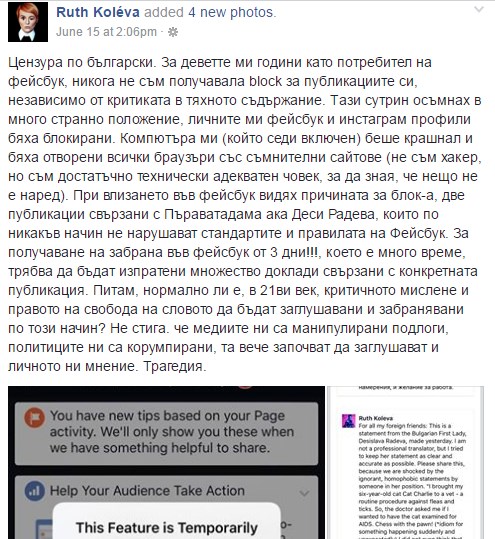 Ето какво написа певицата: "Ей такива неща се случват в 21 век в БеГе, ако дръзнеш да имаш мнение. 3 дена без фейсбук ми дойдоха разведряващо, но чувството на посегателство върху свободата на словото (и духа) си седят."