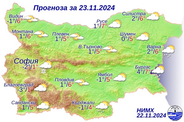 В Източна България ще продължи да духа силен югозападен вятър до полунощ, докато в останалата част от страната вятърът ще се преориентира от запад-северозапад, носейки със себе си студени въздушни маси. Минималните температури ще варират между минус 3 и 2 градуса, по морското крайбрежие ще достигнат от 3 до 5 градуса, а в столицата София ще паднат до минус 2 градуса.