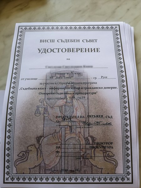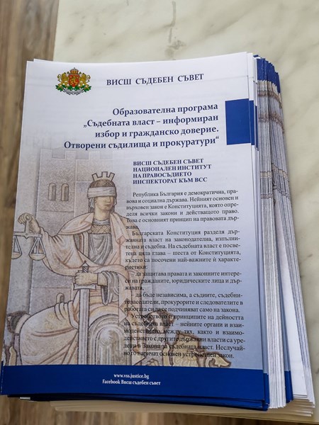 В края на срещата всеки младеж получи информационна брошура, представяща Висшия съдебен съвет и удостоверение за участието си в Образователната програма „Съдебна власт – информиран избор и гражданско доверие. Отворени съдилища и прокуратури“.