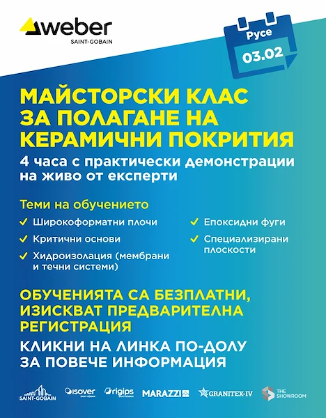 На 3 февруари 2026 г. в хотел „Космополитан“ в Русе ще се проведе специализирано професионално обучение – майсторски клас за полагане на керамични покрития, насоченo към всички професионалисти в областта на строителството.Обучението ще се проведе от 14:00 до 18:00 ч. и е с ясно изразена практическа насоченост – 60% практика и 40% теория, с демонстрации на живо и възможност за директни въпроси към лекторите.