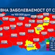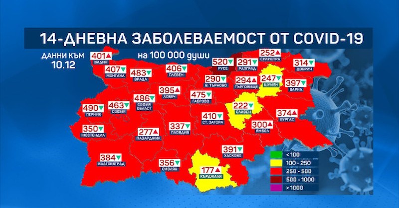 Най-ниски са стойностите в областите Кърджали - 176.64 на 100 000, Сливен - 221.86, Шумен - 247.41 на 100 000 души население. В червената зона отново е Силистра, където заболеваемостта е 251.75 на 100 000.