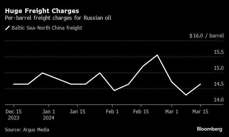 Разходите за доставка на руски петрол са огромни. По данни на Argus Media доставката на товар от Балтийско море до Китай струва около 14,50 долара на барел. По нейни оценки над половината от тази сума се дължи на санкциите.