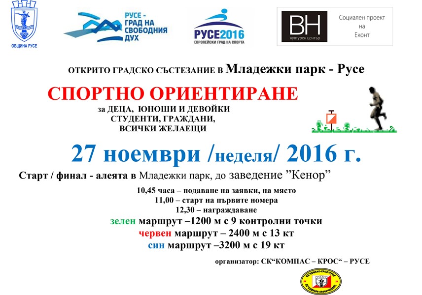 На 27 ноември (неделя), от 11:00 часа, в Парка на младежта, СК "Компас-крос" организира състезание по спортно ориентиране.