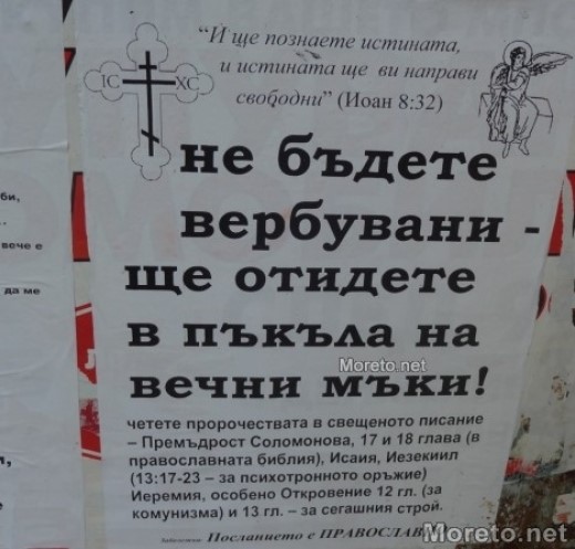 На броени метри от школскитe дворове, стотици деца и младежи могат да прочетат странни послания, едно от които призовава и предупреждава „Не бъдете вербувани, ще отидете в пъкъла на вечни мъки!“. Част от афишите съдържат цитати от библията, други пък – рефрени от песни на популярни сред тийнейджърите изпълнители като Криско, Павел и Венци Венц.