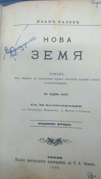 Доц. Добрил Христов и съпругата му Румяна подариха на библиотеката рядък екземпляр от второто издание на "Нова земя" на Иван Вазов - "роман из живота на българите в първите години след Освобождението". Книгата е илюстрирана с 19 творби на Иван Мърквичка, Антон Митов, Йозеф Обербауер и Георги Канела. Романът излиза от печат през 1896 г. в Централна печатница Т. Ф. Чипев, София. Благодарим сърдечно на нашите дарители!