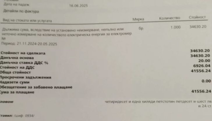 "Оказа се, че този “опитен” майстор ни е вързал захранващия кабел преди електромера," разказва Николаева. В резултат на това дружеството служебно начислява сметка от 41 500 лева за периода от ноември 2024 г. до май 2025 г., въпреки че етажът все още не се обитава.