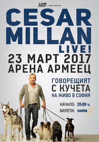 Корифеят в комуникацията с кучета Cesar Millan ще гостува в София следващата пролет със своето образователно и забавно шоу на живо, в което ще сподели уникални техники за създаване на балансирана и спокойна връзка между стопаните и техните любимци. Европейската обиколка през март 2017 на “Говорещият с кучета” включва само 15 дати в 10 страни и за огромно наше удоволствие страната ни попада сред тях. Събитието на 23 март в зала Арена Армеец е организирано от Loud Concerts.