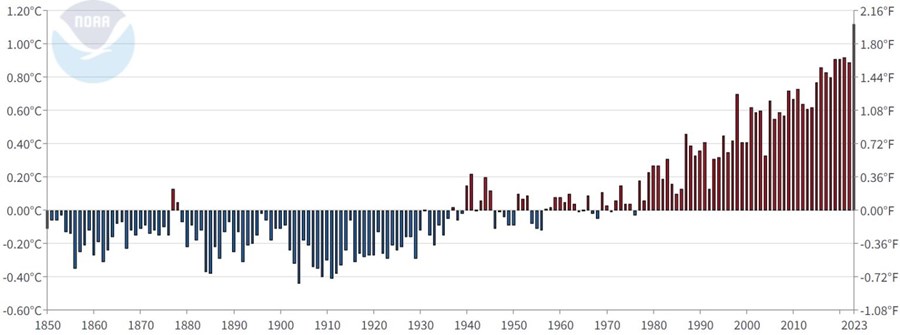 При анализ на данните от архива на NOAA, в който има данни от 1850 г., се потвърждават данните от Коперник, че септември 2023 г. е най-топлият септември в цялата 153 годишна история на глобалните месечни средни температури, както и че има толкова голяма стойност на аномалията, с която се превъзхождат следващите в класацията за най-топли месеци. Тенденцията на повишение на средната глобална септемврийска температура е 0,35 °С на десетилетие.