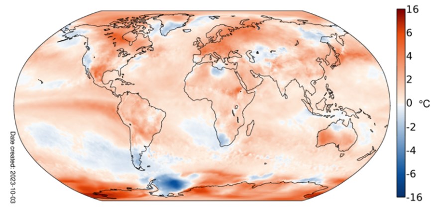 Фигура 3. Аномалии на средната температура на въздуха за септември 2023 г. спрямо нормата за 1991 – 2020 г. за цялото земно кълбо. Източник: NOAA