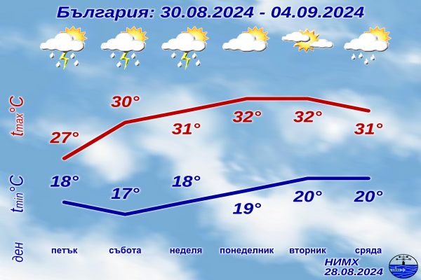 В сряда отново ще настъпи промяна във времето. Купеста и купесто-дъждовна облачност ще се развива над по-голямата част от страната, като на места ще има краткотрайни валежи и гръмотевични бури. Въпреки това, температурите ще останат без съществена промяна, като ще се задържат в границите между 30 и 35 градуса.