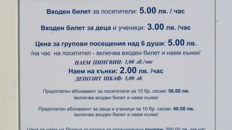 Предвиден е и предплатен абонамент за 10 посещения за сумата от 40 лв. за деца, а за възрастни - 56 лв. Цената за групови посещения до 6 души, включваща входен билет и наем на кънки, е 5 лв. на час на посетител.