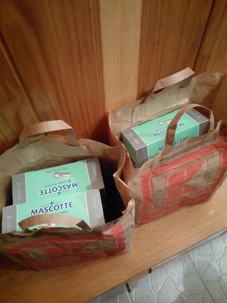 Част от домашно произведените цигари са открити в лек автомобил „Пежо 307", управлявано от мъж от Русе. При проверка на колата митническите инспектори открили на задната седалка две хартиени чанти, пълни с общо 25 картонени кутии с надписи „Mascotte", „X-Long Filter" и „200 Filter Tubes". Всяка от кутиите съдържа около 200 къса готови цигари, произведени в домашни условия като са използвани цигарени заготовки с филтър, които свободно се продават в търговската мрежа.