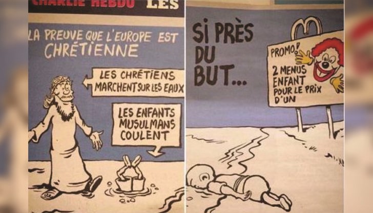 Френският сатиричен вестник "Шарли Ебдо" бе разкритикуван остро заради публикация на карикатури на 3-годишния Айлян Курди, който се удави при опит да избяга с родителите си в Гърция.