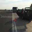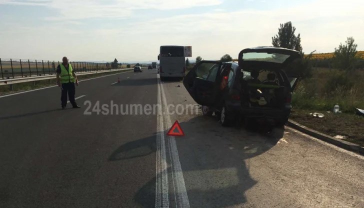 Инцидентът е станал малко след 17 часа край бензиностанция до пътен възел „Каспичан“ в посока Шумен. Румънският автобус „Сетра“ е излязъл от бензиностанцията и се е включил в магистралата, без да изчака лекия автомобил „Рено“ на главния път. Колата не е имала шанс да избегне автобуса и е последвал жесток удар.