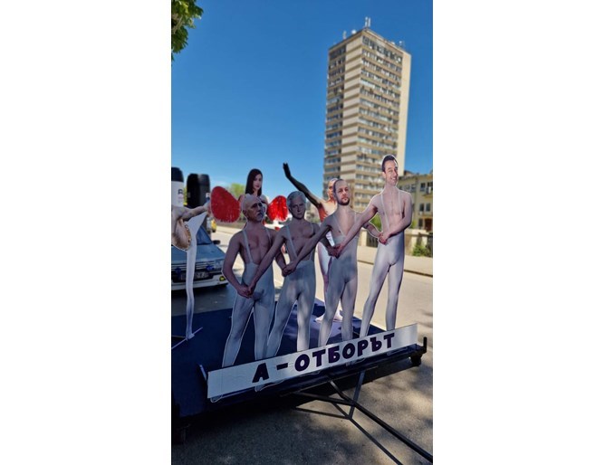 Лицата на част от министрите от действащия кабинет пък са поставени върху тела на гимнастици с надпис “А-отборът”. Сред тях са транспортният министър Николай Събев, министърът на вътрешните работи Бойко Рашков, министърът на околната среда и водите Борислав Сандов и министърът на иновациите и растежа Даниел Лорер. Зад тях се вижда регионалният министър Гроздан Караджов.