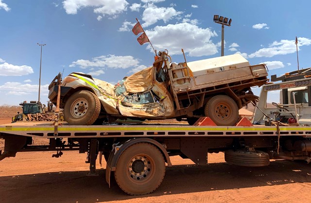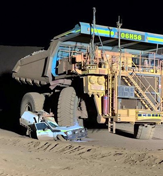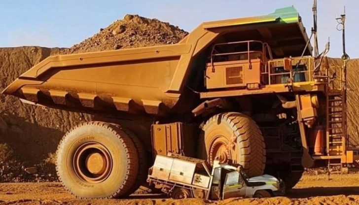 Водач на натоварен кариерен самосвал Komatsu премаза без да иска собствената си Toyota Land Cruiser 70 в рудник в Западна Австралия, съобщава ABC.net.