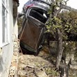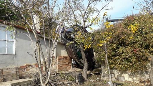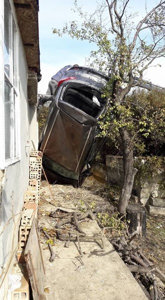Колата е излязла от пътя и се е забила като пирон челно между къща и пътя.