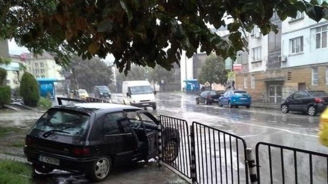Зрелищен инцидент стана тази нощ в центъра на Благоевград. Лек автомобил "Рено Клио" се заби в крайпътни огради, прескачайки от улица без изход през тревна площ и тротоар.