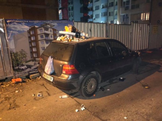 На снимките се вижда автомобил, чийто таван е засипан с боклуци, а на чистачките на задното стъкло е закачена торба с отпадъци.