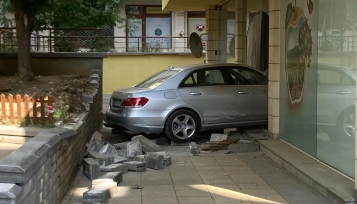 Сивият автомобил "Мерцедес" буквално влиза в остъкленото помещение на партерния етаж, разбивайки стъклената витрина и част от каменната ограда. За щастие при инцидента няма пострадали хора, а помещението, в което автомобилът "паркира", е празно.