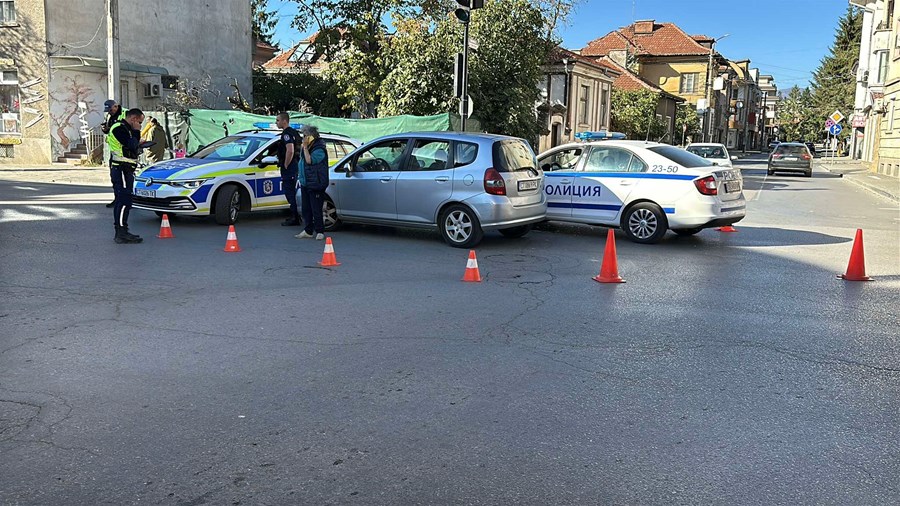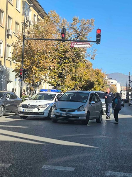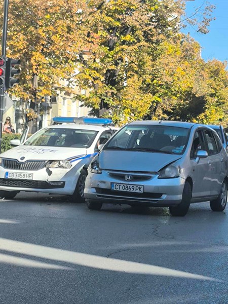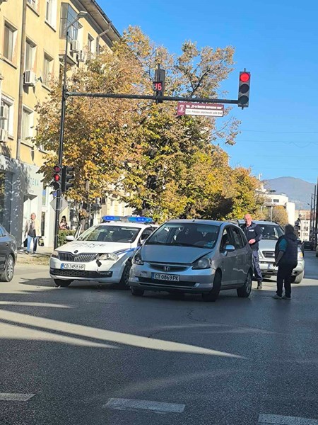 Пътнотранспортно произшествие между лек автомобил "Хонда" и полицейски автомобил е станало на кръстовището между улица "Христо Ботев" и булевард "23-ти Пехотен Шипченски полк" в град Казанлък.