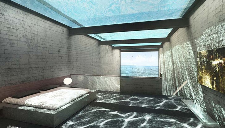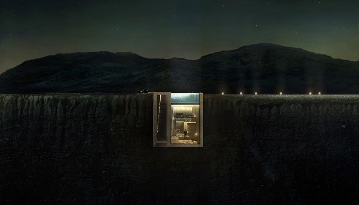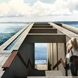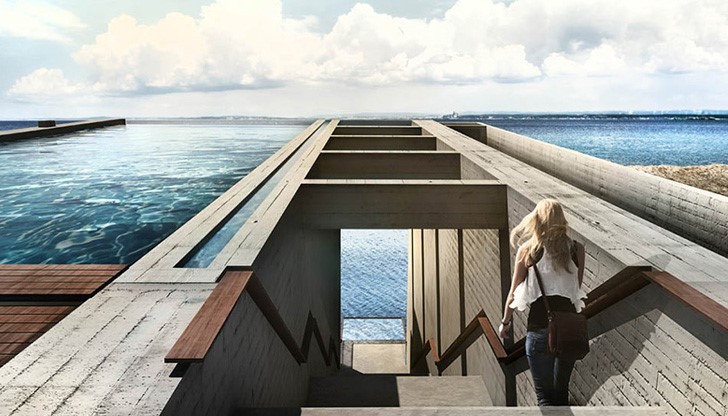 Басейнът на покрива (на нивото на земята) и подземните стени изолират сградата и създават уникалната й атмосфера.