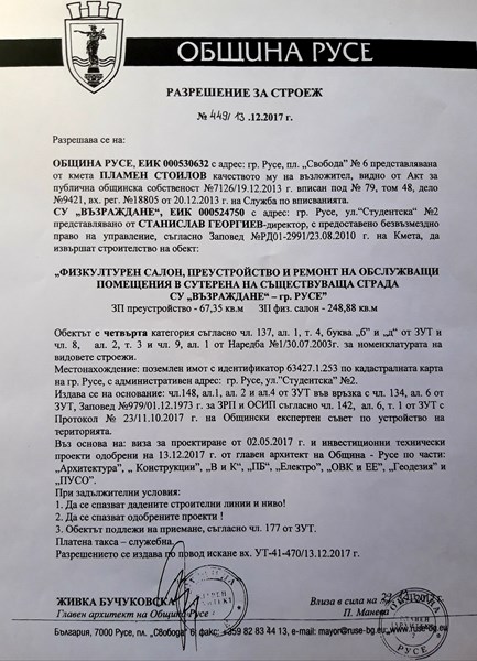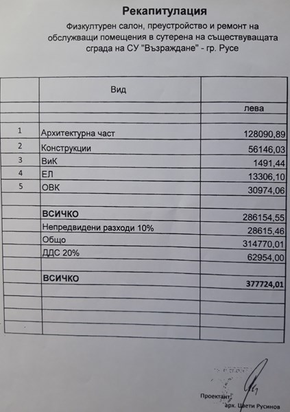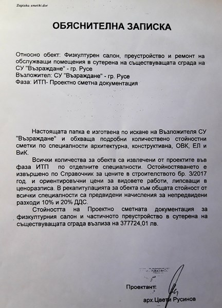Относно: Изграждане на физкултурен салон, преустройство и ремонт на обслужващи помещения в сутерена на съществуваща сграда ‘‘ в СУ "Възраждане‘‘- гр.Русе
