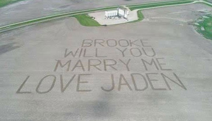 На кадрите се вижда огромната й изненада, когато по време на подарения от приятеля й полет вижда надписа: „Брук, ще се омъжиш ли за мен? Обичам те, Джейдън”. А определено предложението за брак е мащабно – то се разпростира върху 40 дка земя.