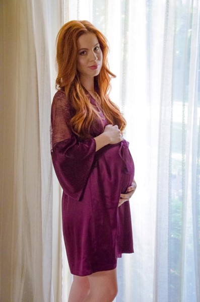 На фотосите тя позира в ефирни рокли, които деликатно подчертават напредналата ѝ бременност.