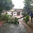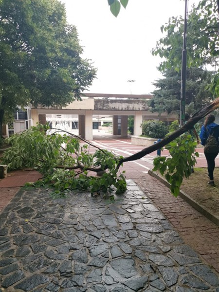 Стихията, която вилня около половин час, е изпочупила дървета. Силният дъжд, придружен с гръмотевици и силен вятър, бързо превърна улиците в реки и създаде временни затруднения в движението в ниската част на града в посока ЮЗУ, пише Uniconbg.com.