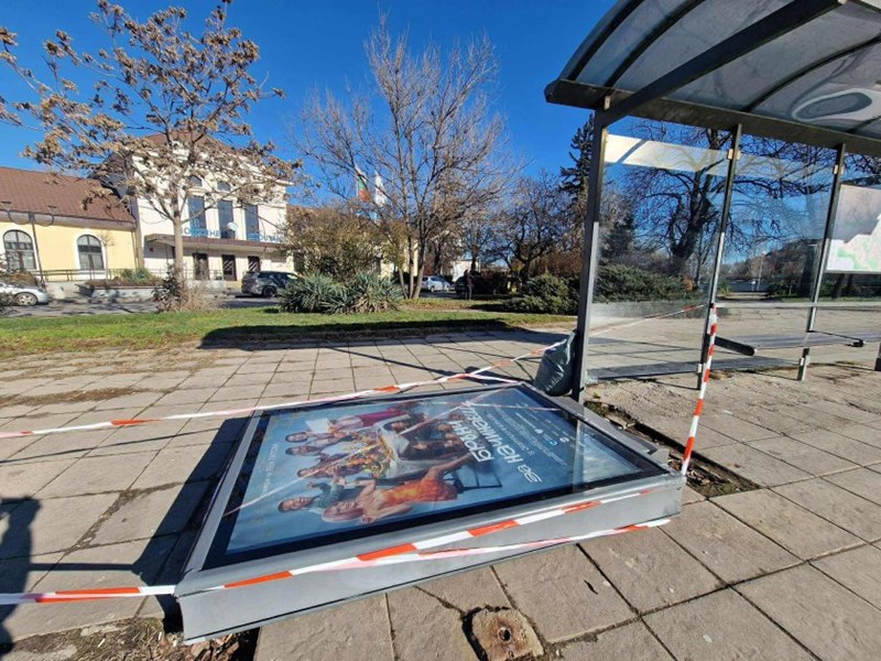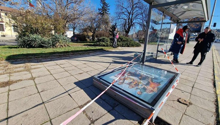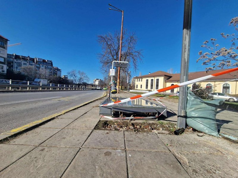 Повредените масивни елементи и счупени стъкла все още се намират на тротоара, непосредствено до зоната за изчакване. Липсата на пълно обезопасяване или своевременно отстраняване на отломките създава предпоставки за инциденти, особено при нови пориви на вятъра, които могат да разнесат по-леките части.