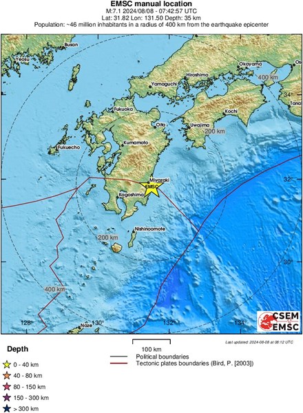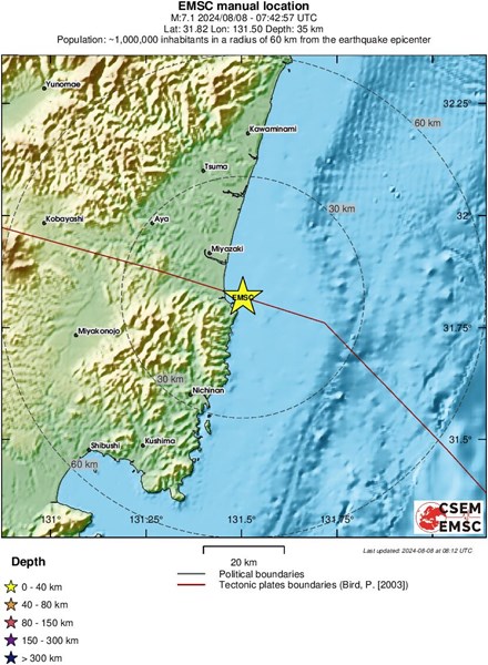 Издадено е предупреждение за цунами за няколко региона в югозападните японски острови Кюшу и Шикоку. Вълните могат да достигнат до метър.