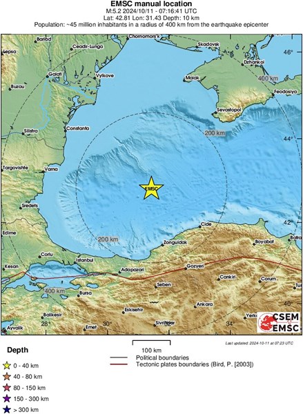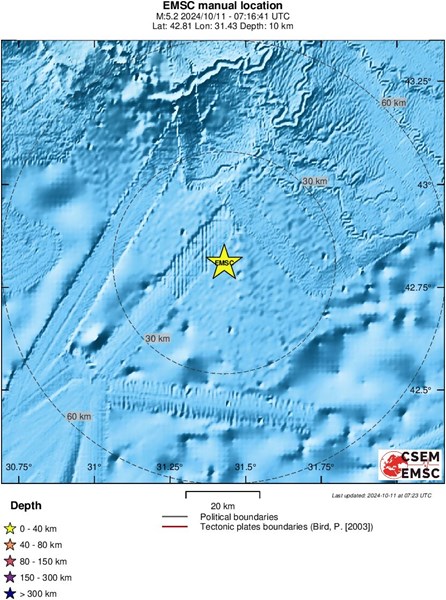 На 11 октомври 2024 година, в 10:16 часа местно време, силно земетресение разтърси акваторията на Черно море, според данни на Европейско-средиземноморския сеизмологичен център (EMSC). Трусът, с магнитуд 5.2 по Рихтер, е регистриран на дълбочина 10 километра под морското дъно.
