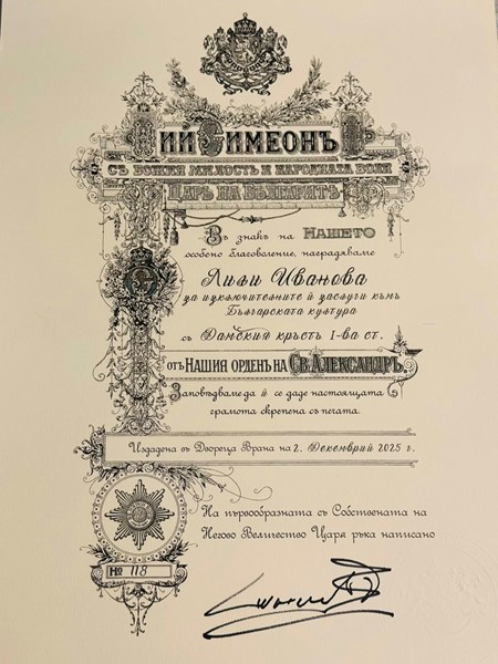 "С особено благоволение награждаваме Лили Иванова за изключителните ѝ заслуги към българската култура с Дамски кръст, първа степен, на нашия орден 'Свети Александър'. Заповядаме да ѝ се даде настоящата грамота, скрепена с печата на първообразната със собствената на Н.В. Царя ръка", гласи текстът на отличието.