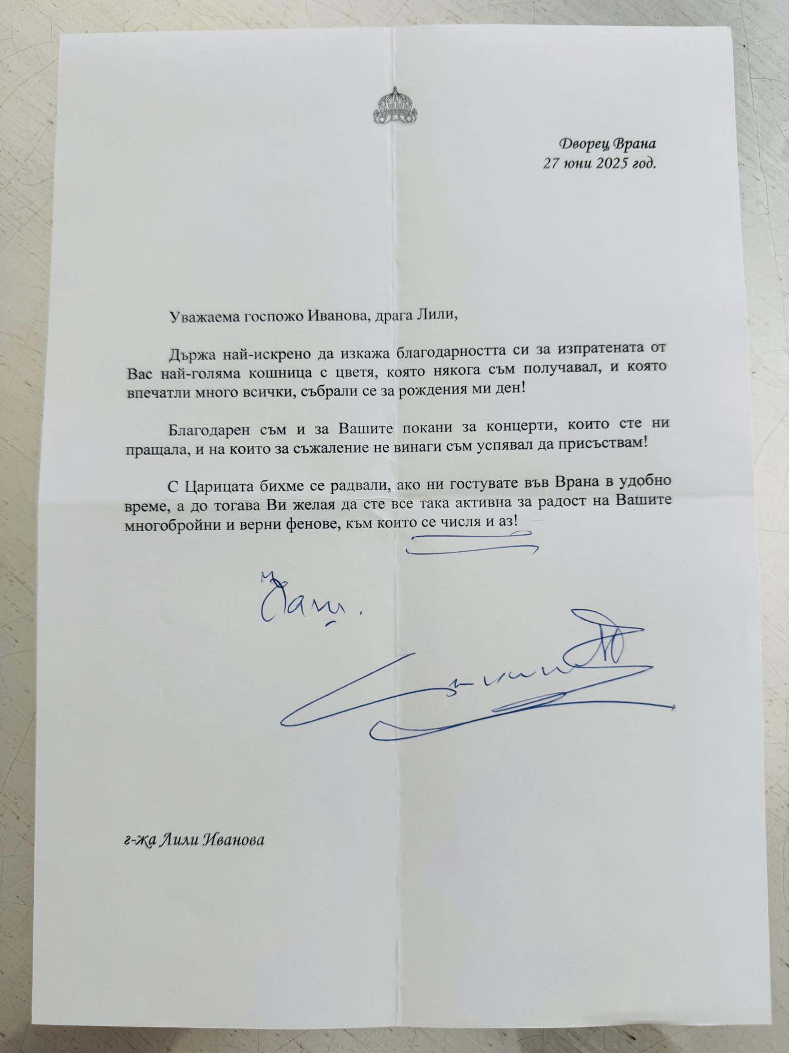 Цар Симеон II отправи лично писмо до легендарната българска певица Лили Иванова, в което я благодари за впечатляващия подарък за рождения му ден и я покани да гостува във Врана заедно с царица Маргарита.