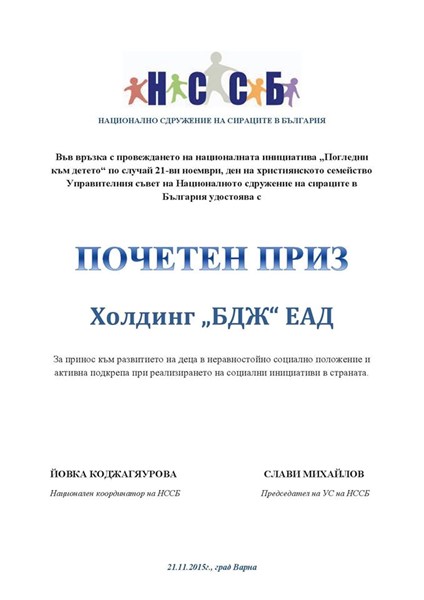 Вчера, (20-ти ноември), Националното сдружение на сираците в България (НССБ) връчи на ръководството на „Холдинг БДЖ” ЕАД почетен приз за принос към развитието на деца, лишени от родителска грижа и активна подкрепа при реализирането на различни социални инициативи.