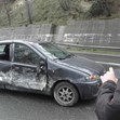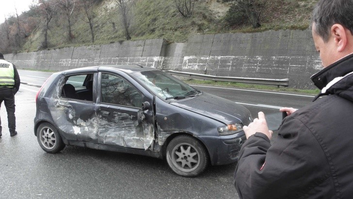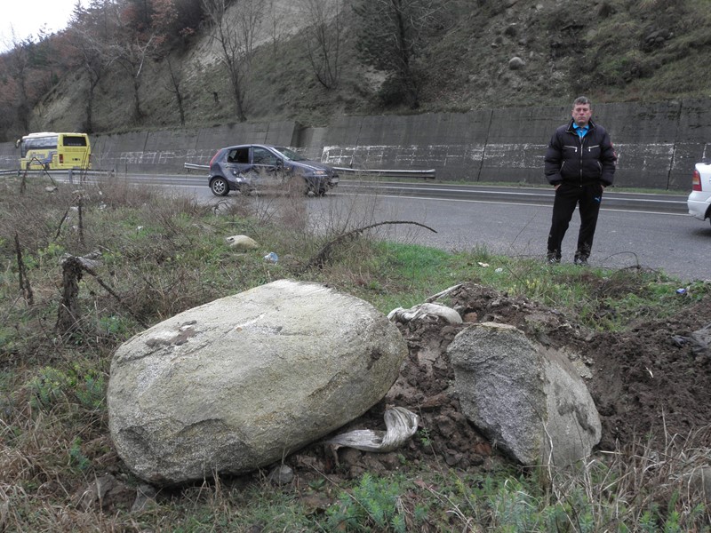 При удара отстрани са смачкани и двете врати, съпругата на шофьора нямаше как да излезе, откъснато е и страничното огледало. Към 9 часа пристига фадрома на пътно поддържащата фирма, която избута камъка, ударил автомобила и още няколко по-малки от пътното платно.