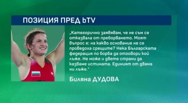 bTV с нови разкрития по скандала в националния отбор по борба. Казусът стигна до министъра на спорта. Арбитър на спора между Биляна Дудова и националния селекционер Петър Касабов вече е Радостин Василев. Той изслуша боркинята и се ангажира с изясняване на случая.