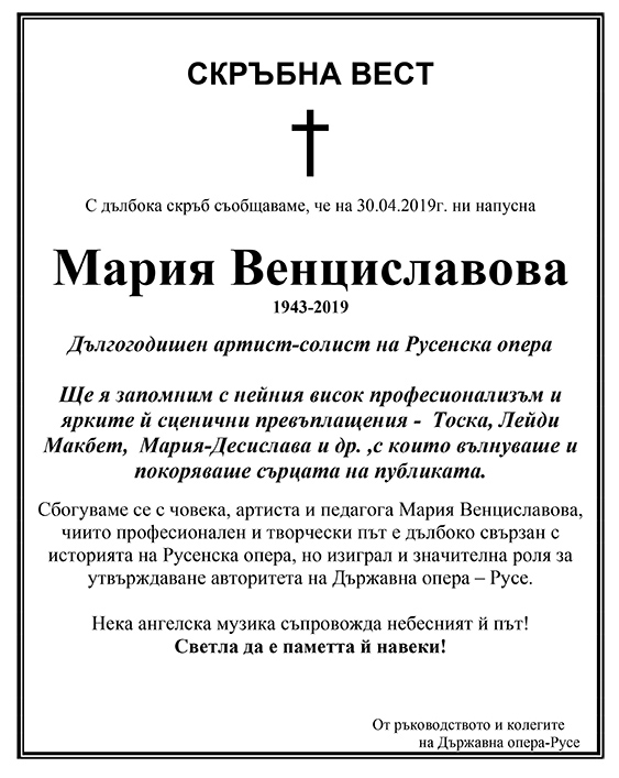 Сбогуваме се с човека, артиста и педагога Мария Венциславова, чиито професионален и творчески път е дълбоко свързан с историята на Русенска опера, но изиграл и значителна роля за утвърждаване авторитета на Държавна опера – Русе.