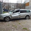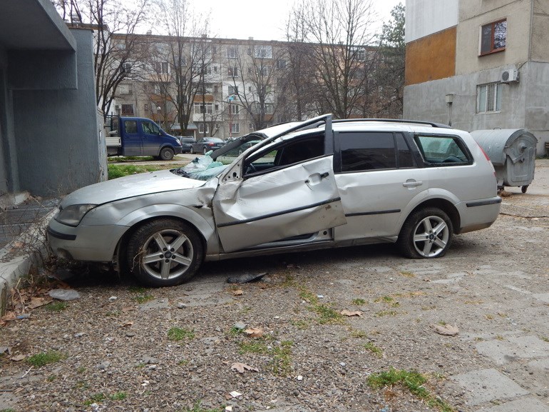 Участници в катастрофа скриха потрошената си кола до контейнери за смет зад блок на бул. „Дунав” в Пловдив.