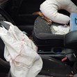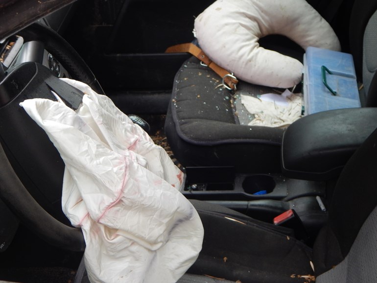 Автомобилът е с огънати ламарини, а по отворената въздушна възглавница има следи от кръв. Десният му преден фар е потрошен и по него също има кървави дири, като явно от тази страна на колата е настъпил удара, научихме от Монитор.
