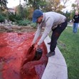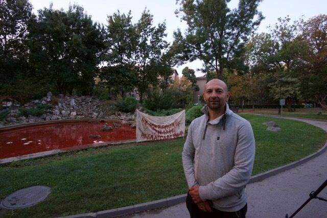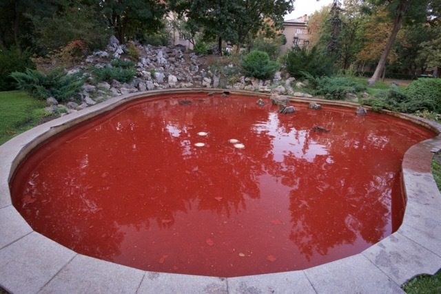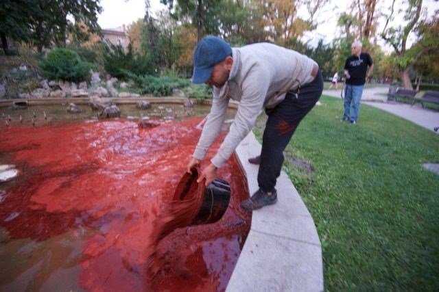 Скулптор боядиса фонтан в кървавочервено по случай 9 септември