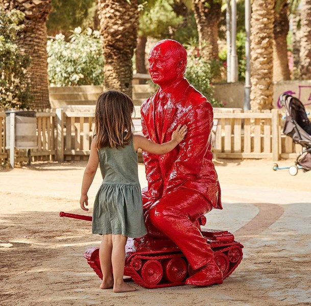 "Тази скулптура има за цел да заклейми абсурда на войната и да покаже колко смели са децата, когато са изправени пред такива катастрофални ситуации", написа Коломния в Инстаграм.