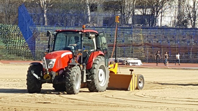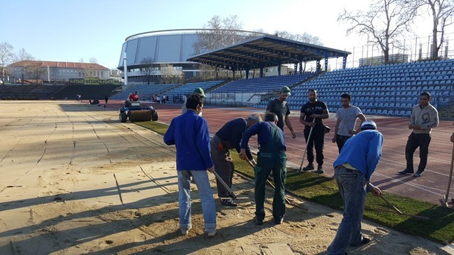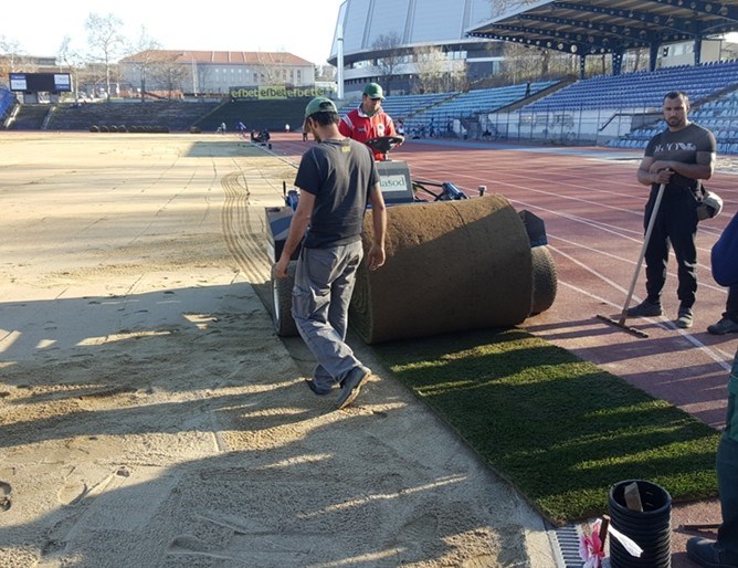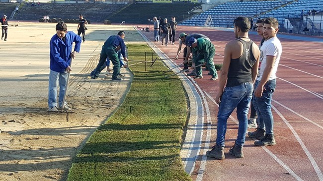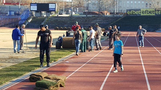 Три от общо 11 ТИР-а с рулоните пристигнаха от Гърция сутринта и бяха разтоварени на стадиона. От обяд започна и подготовката за поставянето. Теренът беше обилно напоен в тази си част, която се затревява първа. С лазарен грейдер бяха загладени и последните неравности по стадиона, а след това пясъкът отново бе валиран. Очаква се до събота цялата тревна настилка да бъде поставена. Тя обаче ще се нуждае от време, за да се вкорени и да се хване здраво, предаде 24 часа.