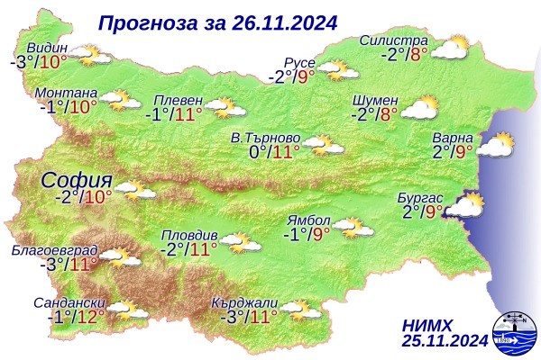 През нощните часове небето ще бъде предимно ясно, с почти пълно затишие. Сутринта в низинните части, котловините и около водните басейни се очаква образуване на мъгла или ниска слоеста облачност. Термометрите ще отчетат минимални стойности между минус 4 и 1 градуса, като в столицата температурите ще са около минус 2 градуса.