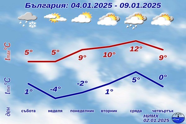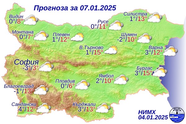 През деня ще се радваме на предимно слънчево време с лек вятър от запад-югозапад, а в западната част на Дунавската равнина - от изток. Максималните температури ще бъдат между 4° и 9°, като в столицата те ще достигнат около 4°.